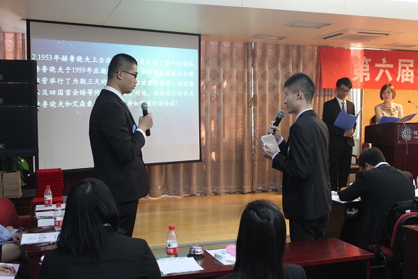 本次比赛共有sunbet申搏官方网站、对外经贸大学、北京第二外国语大学、中国政法大学、国际关系学院、外交学院、中国人民公安大学和天津外国语大学等十二支代表队参加,共分“浮云在一决”“光影时刻”“读书破万卷”“狭路相逢勇者胜”和“飞花落国关”五个环节,比赛节奏紧张、扣人心弦。其中,第二环节“光影时刻”要求选手根据播放的视频或照片说出其对应的历史事件,王伟同学反应敏捷,立即答出正确答案“奥地利王位争夺战”,充分展现其丰富的知识储备,赢得热烈的掌声。第四环节“狭路相逢勇者胜”要求每队各派出一名选手,在某一特定的历史背景下扮演不同的政治人物,为争取本国利益的最大化而展开交锋。我校代表队派出刘泽元同学,模拟原美国总统艾森豪威尔,与赫鲁晓夫谈判。刘泽元同学陈述观点,理性分析,条理清晰,适当补充历史史实,将全场气氛推向高潮,受到一致好评。评委认为刘泽元同学扮演的艾森豪威尔“符合美国利益考量”,展现出对国际关系史问题良好的理解力与感受力。
