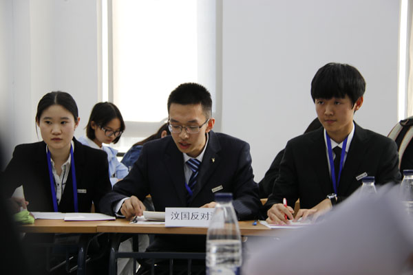 在第二场谈判中,我校代表国际联盟(赛题中假想的国际组织)与由中国劳动关系学院代表的以国和由西安外国语大学代表的巴国,就停火协议、边境划定、水资源供给、盟军进驻和反恐等议题进行谈判。第二场谈判以现实中的巴勒斯坦和以色列冲突为主要背景,我方作为世界性的国际组织,主要充当调停者的作用。我校选手倾听巴以双方的利益和诉求,协调双方进行妥协、让步,促成了双方停火和水资源供给协议的达成。在本次谈判中,三方代表创造性地提出了“巴以双方在现有边境基础上各退让10公里形成中立地带,由国际联盟军维护该地区的和平稳定”的新解决方案,受到在场评委老师的高度评价。