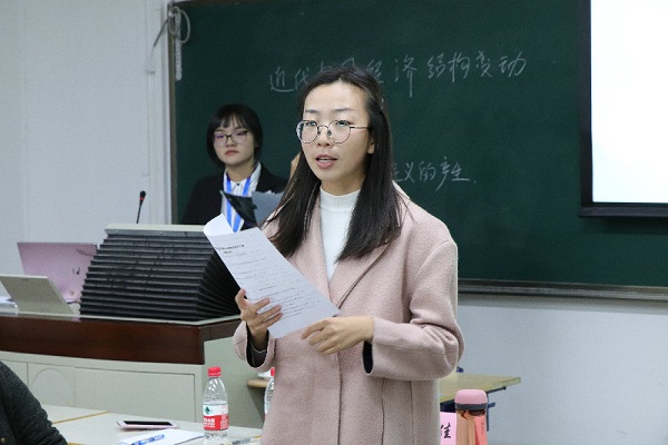 207教室比赛的评委有sunbet申搏官方网站湛晓白老师和赵雨佳师姐。1号选手钟朦同学、2号选手郑伊楠同学、3号选手李斌同学、4号选手黄雅雯同学皆以视频引入或提问互动的方式完整地展示了他们的课题。评委们也针对选手们的内容进行了相应的提问。赵昕昕选手作为第五位参赛选手上台,她先以汉语词典中对“革命“的解释引入了她的课题——光荣革命,并详细地讲述了光荣革命的特点、背景、原因和意义等,条理清晰。最后一位选手蒙丙文以近代中国经济结构的变动为题详细地阐述了民族资本主义产生的条件和背景,内容充实。至此,全体选手展示完毕。评委们对各位选手的优缺点进行了点评。湛晓白老师在赞赏选手们教态自然、知识点涵盖全面的同时,也指出了选手们对ppt过于依赖的缺点并提出了改进的希望。而赵雨佳师姐则表示,应把比赛的过程当做学习的过程。最后主持人宣布比赛结果,赵昕昕、蒙丙文两位选手以第一、第二的成绩获得本次比赛优秀选手的殊荣。