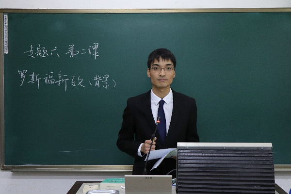 202教室比赛的评委有sunbet申搏官方网站孙会修老师和丁昊师姐。第一位上场的是历史学院的张端成选手,他以“罗斯福新政背景”为课题,重点讲述了美国经济危机前采用的自由放任政策这一历史道路。他运用了大量史料,同时在PPT的展示上将图文充分结合,增加了课程的趣味性与吸引力,展示出该选手深厚的史学功底。第二位上场的选手是历史学院的田欣怡。她所讲的“1929-1933资本主义世界经济危机爆发原因探究”一课,通过有关材料合理推导出危机爆发的诸多原因,令在场的人不禁击节赞叹。六位选手展示完毕,两位评委在教态台风、语速节奏、亮点呈现、图文设置和重难点把握等方面为选手们提出了建议,使选手们得到了经验和提升。最后张端成和田欣怡两位选手分获第一与第二名。
