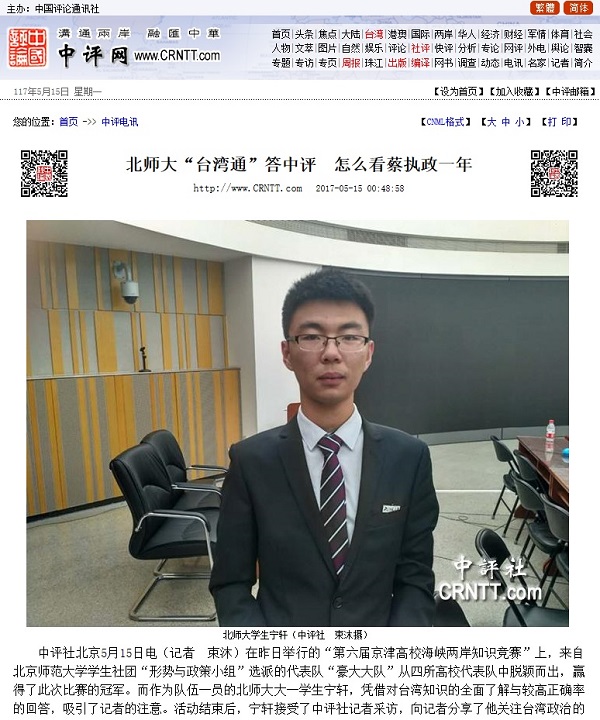 赛后,宁轩同学接受中国评论通讯社的采访,分享了他关注台湾政治的心得。人民政协网等媒体也对本次比赛进行报道。