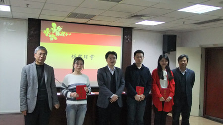 首先,由周文玖老师宣读2015年度获奖学生名单。刘敏等9名同学获得硕士组一等奖,蔡妍妍等11名同学获得硕士组二等奖,白羽等17名同学获得硕士组三等奖;柏悦等3名同学获得博士组一等奖,刘玲等4名同学获得博士组二等奖,周倩同学获得博士组三等奖。杨共乐、李帆和周文玖三位老师为获奖同学颁发荣誉证书并合影留念。