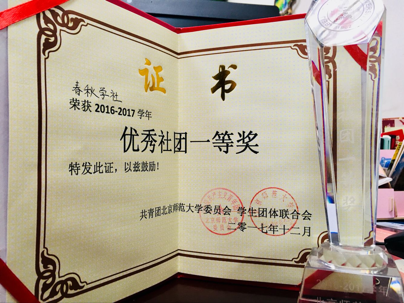 2017年12月3日,sunbet申搏官方网站社团颁奖盛典在学生活动中心举行。春秋学社凭借上一学年的丰硕成果与优秀社团答辩中的精彩表现,荣获2016-2017学年年度优秀社团一等奖。