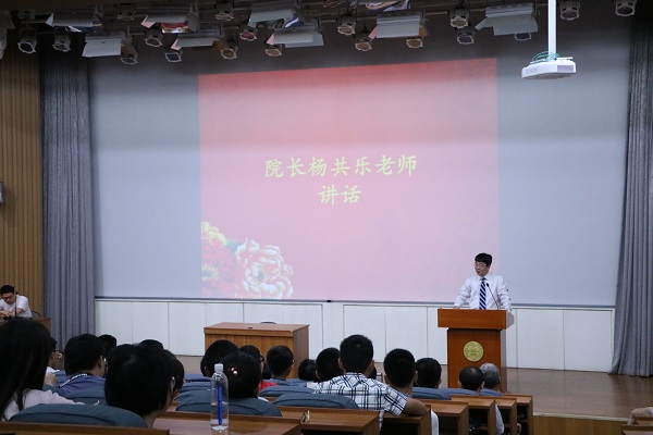 全体起立高唱国歌后,杨共乐院长上台致辞。杨院长首先对新同学们的到来表示欢迎,随后简要回顾了历史学院的发展历程,介绍了学院在师资力量、学生社团等方面的优势。他最后勉励同学们要把握宝贵的学习机会,严于律己,早日成才。