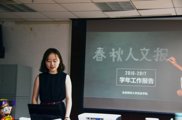 晚8时45分,总结会正式开始。首先由第十二届编委会社长聂诗琦对本年度报社工作进行总结汇报。她从组织结构、社团活动、品牌活动和社团建设四个方面,同时结合年度大事记带领大家回顾了人文报一年来走过的道路和取得的成绩。2016至2017年度,春秋人文报社中层与大一干事们共同努力,出色地完成了第86至89期报纸的发行工作,同时在新媒体运营方面取得了突破性进展,还成功举办了第三届“首都高校大学生家史征文大赛”等优质品牌活动,成果斐然。报社在社团内部的组织、活动、建设等方面加以创新,使社团运行更加顺畅,新生力量得到更好的培养和锻炼。