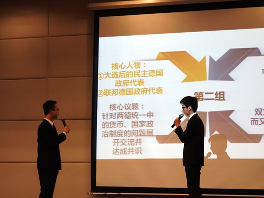 本届比赛共有来自我校与对外经贸大学、北京语言大学、北京外国语大学、中国政法大学、国际关系学院和北京化工大学的八支队伍参赛。比赛共分为“浮云在一决”、“往来成古今”、“读书破万卷”、“狭路相逢勇者胜”、“柳暗花明又一村”五个环节。在前三个环节的角逐中,各代表队均展示出不俗的实力,比分交替上升。第四个环节“狭路相逢勇者胜”要求每队各派出一名选手,在某一特定的历史背景下扮演不同的政治人物,为争取本国利益的最大化而展开交锋。我校代表队派出叶子豪同学,与国际关系学院选手围绕联邦德国和民主德国统一后的货币制度以及政治体制问题展开和平谈判。双方各自陈述观点,理性分析,将全场气氛推向高潮。第五环节“柳暗花明又一村”为决胜环节,比赛进程扣人心弦,选手们使出浑身解数,运用自己的冷静分析和智慧,力争在最后时刻有所突破。