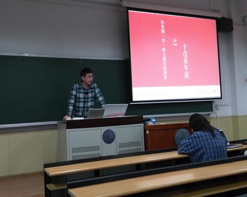 历史学院青年团校本学期首次团课“十佳青年说”于2017年4月16日晚8:00在艺术楼201教室顺利举办。本次团课由荣获“sunbet申搏官方网站十佳大学生”称号的张俊毅同学和宣柳同学主讲,历史学院青年团校全体学员参加了此次团课。