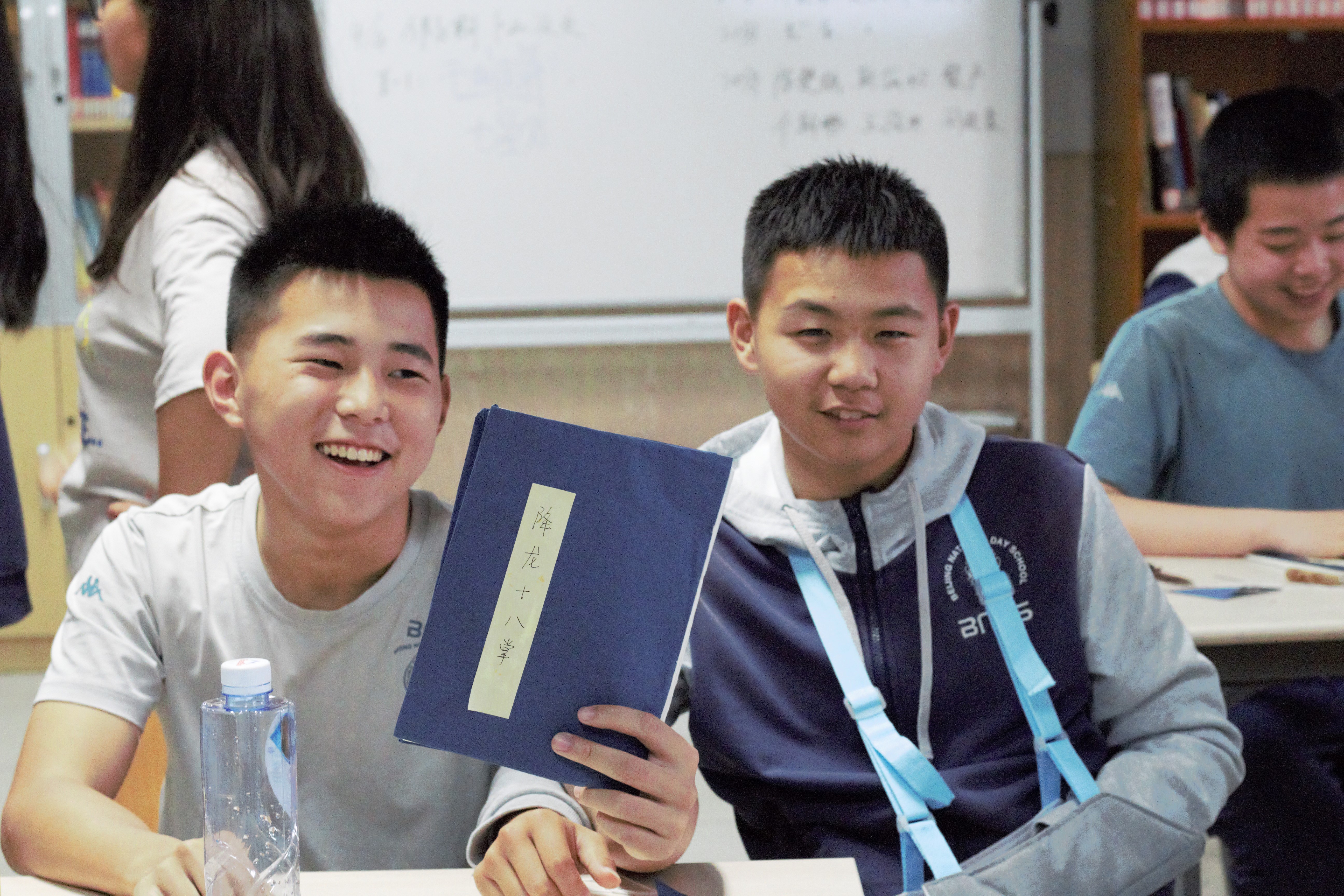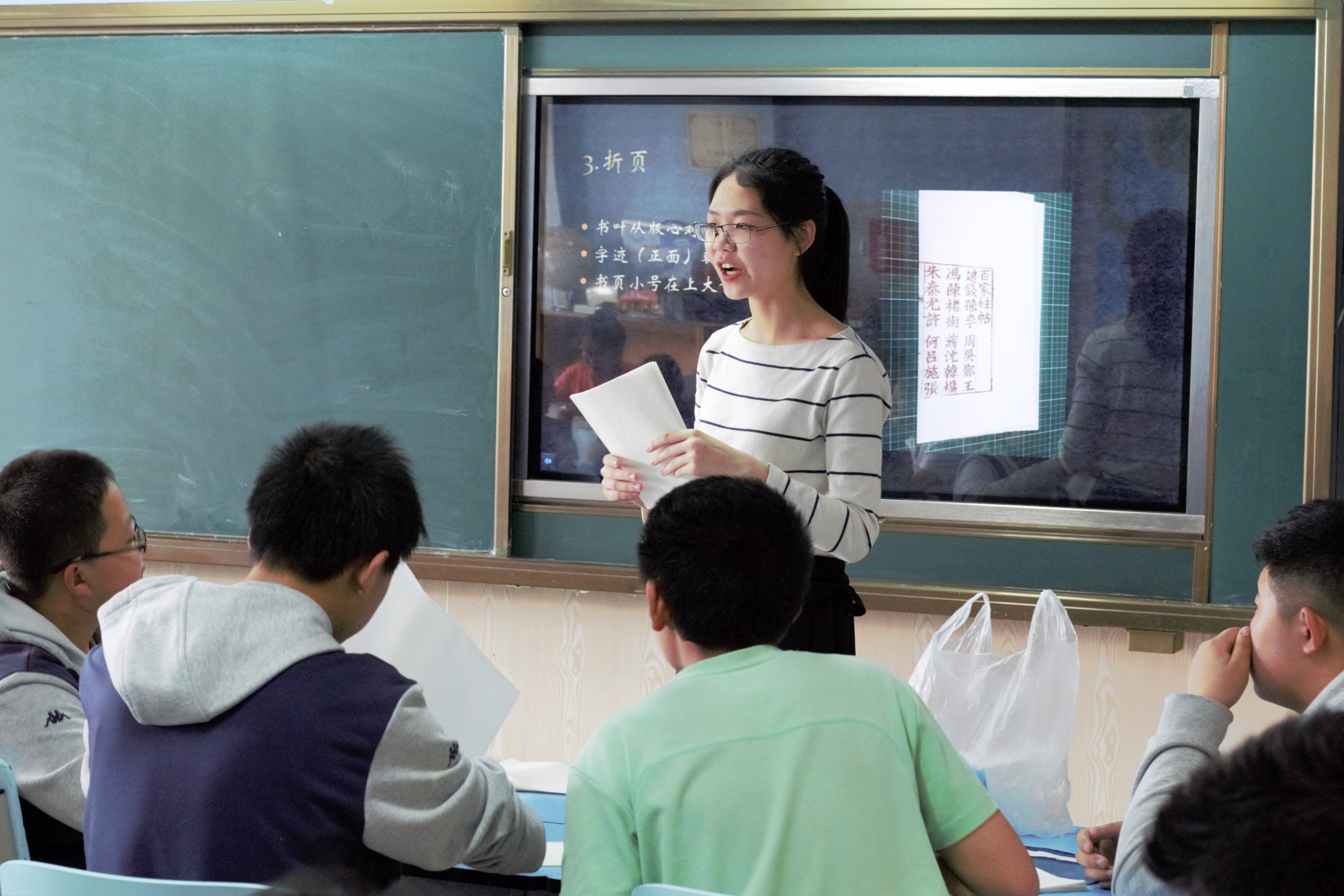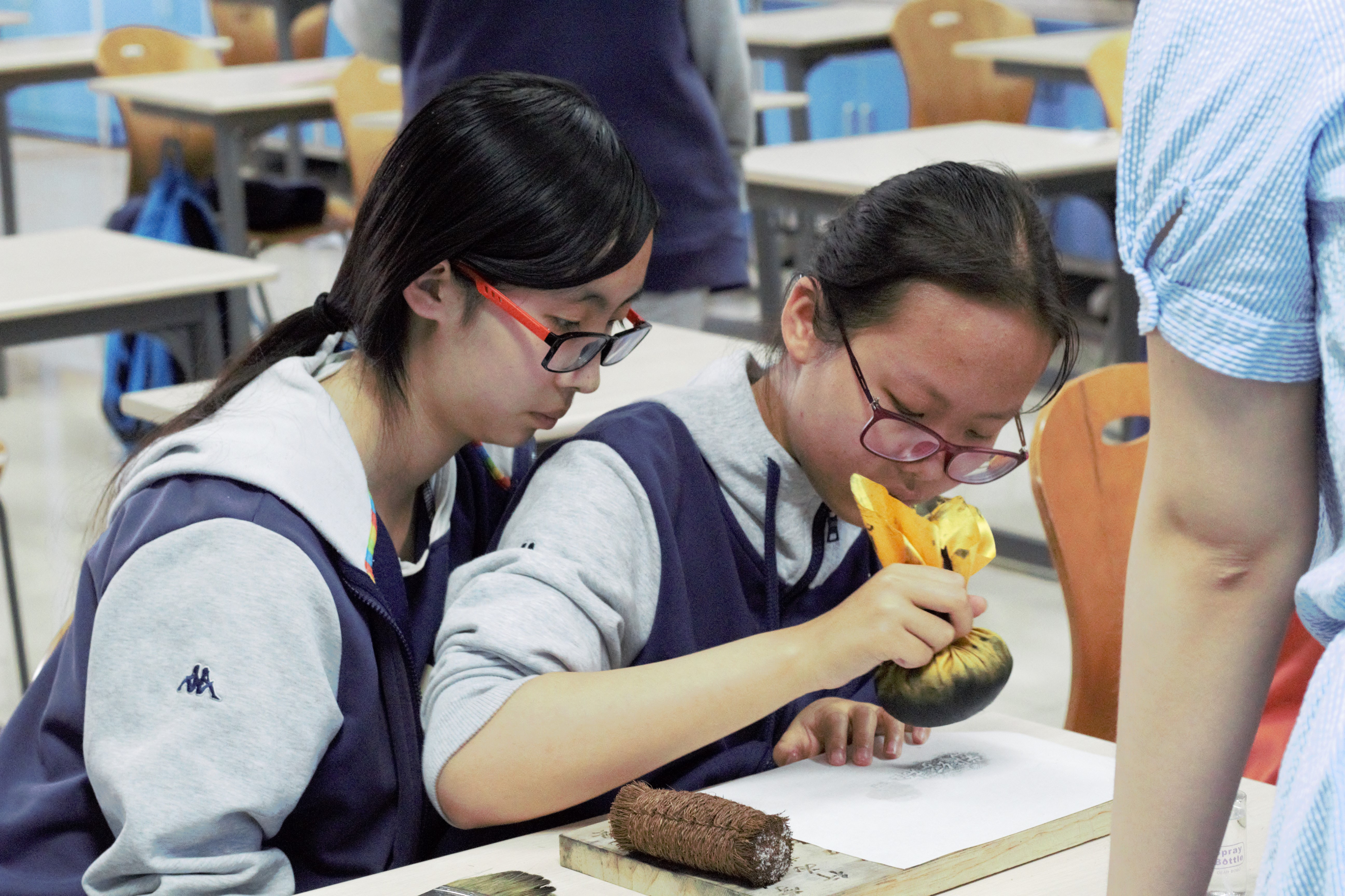 13:30,洪英和王云菲在大讲堂为全体体验同学就线装书和拓印的相关知识作了具体介绍,随后体验活动正式开始。为提高活动的参与度和参与效率,我们将同学们分为三批,分别在三个教室体验不同的项目。其中体验全程制作线装书的同学有25人,以2人为一组的方式合作学习和制作,其余同学则轮流参与半成品线装书制作和拓印活动。