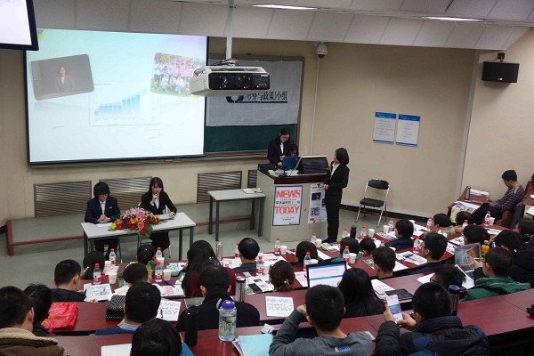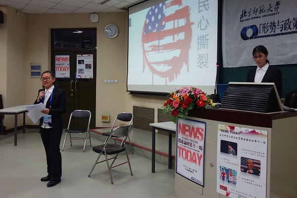 第一组代表秦雅婕同学与马宁同学以“新闻连线”的播报形式,带来《韩国政坛乱局后的风起云涌——从“闺蜜门”事件说起》的展示。该组同学从韩国总统朴槿惠闺蜜干政丑闻不断发酵,最终被韩国国会弹劾的事件切入,分析了朴槿惠“闺蜜门”事件爆发的原因和朴槿惠对待此事的态度,进而探究韩国政治体制和政治文化的特点,以及这些因素对“闺蜜门”事件的深层次影响。第二组代表张巍同学以“美国大选——撕裂的国家抉择”为题,将特朗普出人意料地当选美国总统背后故事娓娓道来。该组通过分析特朗普的经济、移民及安保竞选主张,认为美国社会中下层民众中普遍存在反经济全球化、反自由贸易的情绪,部分中产阶级与海外移民之间长期存在着矛盾,贫富差距极大,美国民众对精英阶层长期秉持“政治正确”抱有极大的不满;而特朗普竞选主张中的贸易保护主义、“民粹主义”与排外主义色彩正好迎合了广大底层白人民众的心理,这些因素构成特朗普当选的深层原因。第三组组长张学骞同学带领全组同学带来《世界女性领导人现状及未来展望》的展示。该组以默克尔难民政策风波、罗塞夫下台、蔡英文支持率暴跌为例,分成三个小组,采用针锋相对的时事评论方式,分析了女性领导人在政坛上面临的困难及其未来走向。最后,该组指出:性别是女性领导人的重要因素,但面对具体问题时不能单独谈性别这一个因素;在和平与发展为主题的时代背景下,女性领导人依然有光明前景。各组展示内容丰富、语言生动、表现力强,特别是在展示的形式上推陈出新,吸引了观众们的注意力,赢得阵阵掌声。
