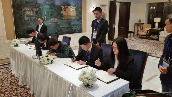 悼念仪式结束后,同学们轮流在吊唁册上留言,签上姓名,表达对普密蓬国王的敬意、对泰国人民的慰问和对中泰两国友谊的祝愿。吊唁活动全程庄严肃穆、井然有序,参与悼念活动的全体成员一一与泰国驻华使馆公使衔参赞符万信等使馆工作人员握手告别。使馆工作人员向同学们表示由衷感谢。