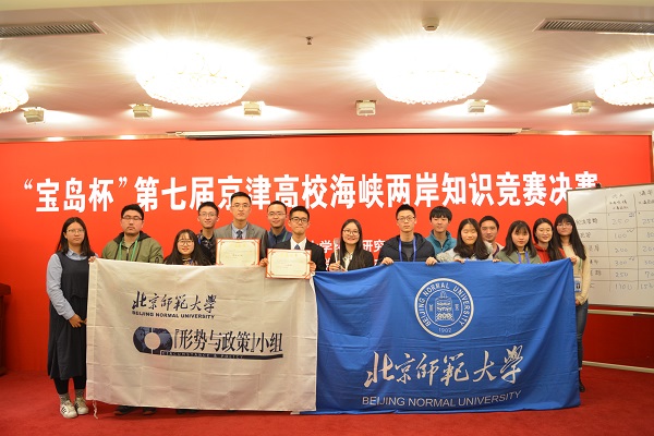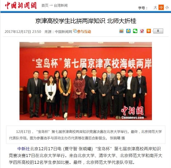 2017年12月17日下午,第七届京津高校海峡两岸知识竞赛决赛在北京大学举行。由我校哲学学院2014级本科生田奥凡、历史学院2016级本科生彭麒霖、文学院2017级本科生林宇轩组成的sunbet申搏官方网站代表队在比赛中表现优异,蝉联冠军。这是我校学生继第一届、第四届、第六届比赛夺冠后,第四次获得该项赛事冠军。sunbet申搏“形势与政策”小组学研专员张家昌、外联专员刘辰、宣传专员洪思音、原组长助理卢冰屿等学生代表应邀观摩了比赛。