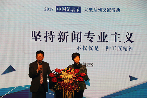 当天下午,在副主编汤阳的组织下,参加记者节活动的春秋人文报成员于中国传媒大学主楼前合影留念。合影后,春秋人文报成员在汤阳的带领下来到中传礼堂,参加主题为“坚持新闻专业主义——不仅仅是一种工匠精神”的大型公益论坛。论坛由知名媒体人敬一丹和中国传媒大学新闻学院院长刘昶主持。中央电视台记者白岩松、中国青年报原社长陈小川、清华大学新闻与传播学院副院长史安斌、人民大学新闻学院副院长周勇等十三位业界学界嘉宾出席参与论坛讨论。论坛上,嘉宾们各抒己见,从不同角度诠释了当下新闻专业主义的内涵,传达出新媒体时代更需要高素质的专业媒体人的信息。论坛分为上下两场,每场结束之后的互动环节中,观众就论坛交流内容积极提问,气氛十分活跃。