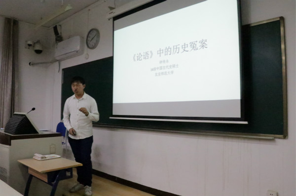 首先,历史学院的钟传永同学以“《论语》中的历史冤案”为题进行了讲解。他从《论语》中“民可使由之,不可使知之”一句入手,讲述了孔子愚民说的由来和从古至今人们对此问题的不同看法,并举一反三,引导同学们多思考问题。接下来,来自文学院的龚玉爽同学讲授了《论语》中的“孝”,她更侧重教学教法的设计,计划事先进行学情调研,教学中添加小组讨论,交流阅读感受的环节,让同学们接受“孝”的概念并运用在日常生活当中。文学院的吴虹讲解了儒家思想的修身之道,具体说明了儒家身心一体,心为身之主宰的主张。她认为儒家的修身思想有助于确立人生之道,还能帮助人实现与道合一、成圣成贤的目标。来自历史学院的高熙智同学从历史影视谈历史,举例说明近二十余年来中国古装剧中的道具、服装、礼仪等方面出现的一些让人啼笑皆非的错误,引得现场笑声不断。他也找来了一些运用得当的正面例子,怀念当年历史剧对艺术的执着追求,批判当下快餐化的影视生态,引人深思。
