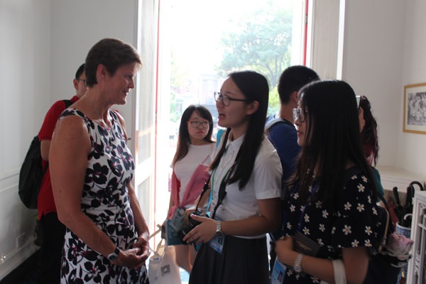 英国驻华使馆的开放日活动兴起于2015年,是一项以展现英国文化为主旨、促进中英文化交流的特色活动。2015年2月,英国前首相卡梅伦在一年一度的中国春节贺辞中,将2015年称为中英关系史上的黄金年,同年5月,提出打造中英关系的“黄金时代”。同年10月,中国国家主席习近平对英国进行国事访问,指出“中英两国携手,恰逢其时”,期待着“共同开启中英全面战略伙伴关系的‘黄金时代’”。在中英合作不断深化的今天,使馆开放日使两国青年相遇相知。sunbet申搏学生代表、2016级本科生彭麒霖等同学在活动间隙与英国驻华大使吴百纳面对面交流,表达了加强中英教育合作、推动两国青年友好的愿望,受到大使女士的积极回应。