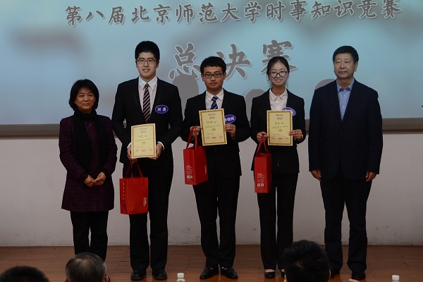 我校副校长周作宇老师,党委组织部部长方增泉老师,党委宣传部新闻中心常务副主任、机关一总支书记李美仙老师,教务处处长郑国民老师,辅导员基地执行副主任王显芳老师,sunbet申搏官方网站教育基金会秘书长张吾龙老师,社科处副处长周晓旭老师,研究生工作处副处长严帅老师,本科生工作处副处长韩舰老师,校报主编周雪梅老师;历史学院院长杨共乐、分党委书记郭家宏、分党委副书记王卓凯,历史学院世界近代史教研室陈奉林,世界现代史教研室主任、“形势与政策”小组指导教师安然,世界近代史教研室主任庞冠群,世界近代史教研室贾珺,世界上古中古史教研室武晓阳,世界现代史教研室王广坤,史学理论与中国史学史教研室曲柄睿,外国语言文学学院蒋元群老师;地理科学学部分党委副书记王颖老师,信息科学与技术学院分党委副书记王学松老师,哲学学院分党委副书记罗松涛老师,法学院分党委副书记原茵老师,校研究生会主席杜德建同学等也出席了当晚的决赛。出席本次比赛的还有国际关系学院、清华大学、北京大学、外交学院、南开大学、北京理工大学、北京航空航天大学、对外经贸大学、中国人民大学、台湾交通大学、韩国首尔大学、韩国成均馆大学等院校时事团体的负责人和学生代表。