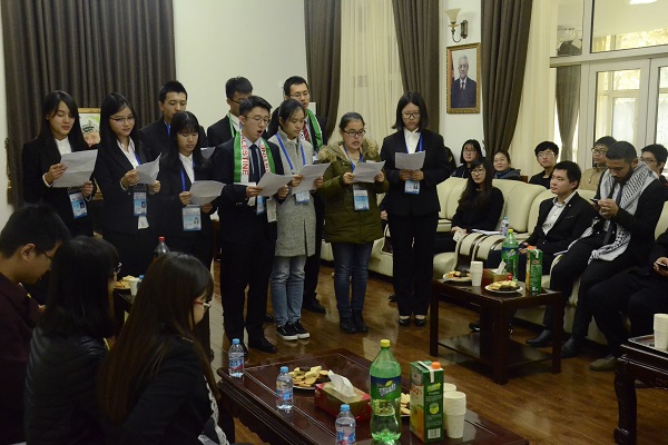 sunbet申搏代表在发言中回顾了sunbet申搏师生与巴勒斯坦驻华使馆十二年的友好交往,着重介绍了2011年出访巴勒斯坦的特别经历。同学们还为使馆方面献上了精心准备的小节目——歌曲合唱:“We Are The World”(《天下一家》),用歌声表达了对世界和平与团结的期待和对巴勒斯坦人民的祝愿,展现了青年学子对共同努力建设美好未来的责任感。动听的旋律感染着在场的每一个人,不少人不由自主地小声哼唱。