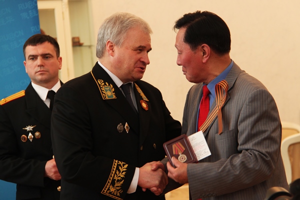 下午四时许,纪念奖章授予仪式在使馆主馆二楼白厅隆重举行。毛泽东女儿李敏、刘少奇女儿刘爱琴,瞿秋白女儿瞿独伊、任弼时女儿任远芳等32名老一辈革命家的后人从俄罗斯驻华大使安德烈·杰尼索夫手中接过荣誉奖章。杰尼索夫大使代表俄罗斯总统普京发表讲话。他表示,俄罗斯和全体俄罗斯人民感谢这些中国老兵为伟大卫国战争胜利做出的贡献,并指出:“我们国家会始终铭记那些曾经保卫和解放苏联、为反法西斯战争做出贡献的英雄,无论他们来自哪些国家。”杰尼索夫大使最后强调,两国青年要牢记这段历史,因为这段历史是两国共同的根。全国政协副主席王正伟在讲话中指出:“中俄两国人民应珍视在第二次世界大战中用生命和鲜血结下的牢固友谊,共同捍卫二战成果和国际公平正义”。伊万诺沃国际儿童院院长、中国老兵代表也先后发言。全体人员为二战烈士默哀一分钟。仪式结束后,同学们参加了使馆招待会,品尝了正宗的俄罗斯美食。