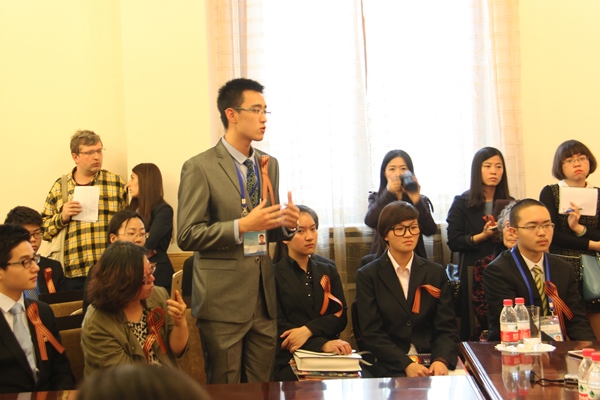在使馆主馆内,同学们参观了为纪念第二次世界大战胜利举办的照片展。一幅幅照片真实再现了苏联卫国战争及苏联红军在中国东北与日军斗争的历史。随后,同学们进入使馆会议厅,与参加纪念奖章授予仪式的中国老兵进行面对面交流,被当时仍处少年时期的中国老兵体现出的坚韧与乐观所打动。“形势与政策”小组田奥凡同学还作为首都高校唯一的学生代表,针对战争时期伊万诺沃国际儿童院师生的艰难岁月向老兵提问。